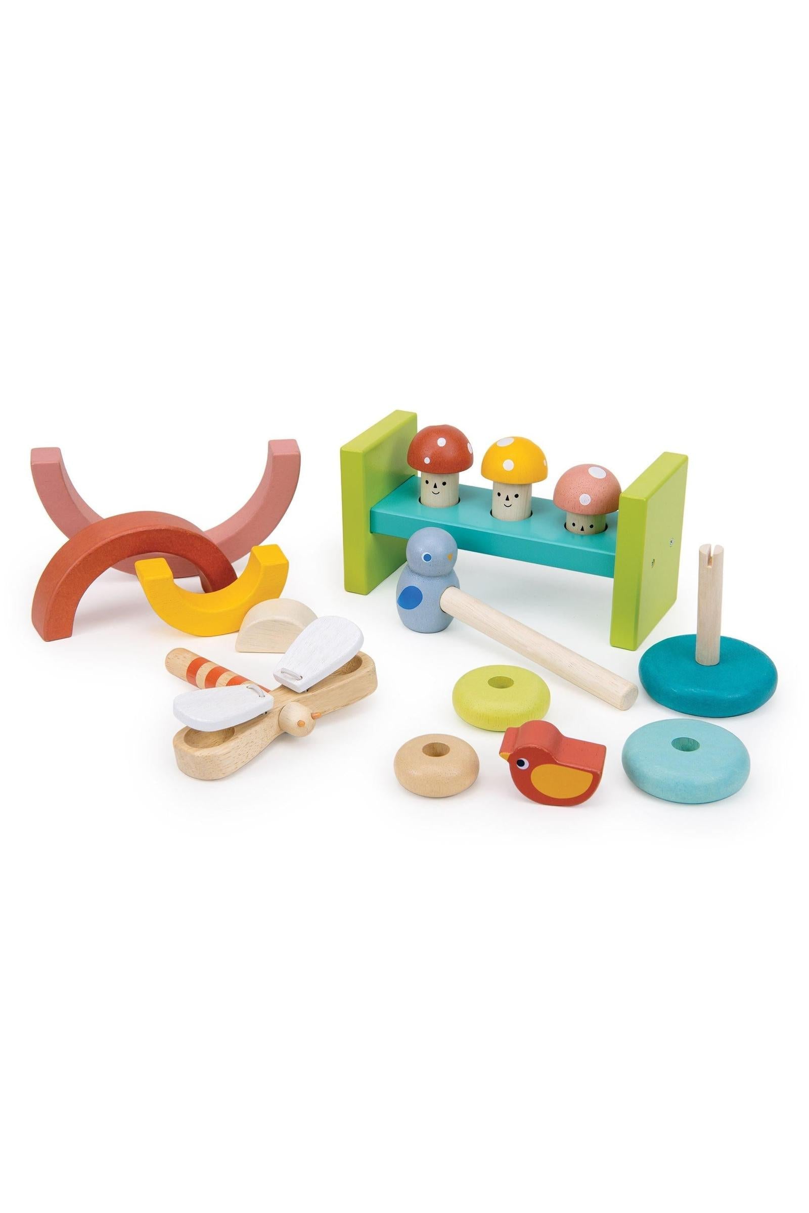 A whole play experience in one handy box that's perfectly designed for your 18~24-month-old. This garden playtime box contains 4 fun early-learning toys and makes a wonderful gift. 5 part stacking tree with bird that requires placing the rings in order to stack. 4 part stacking rainbow tunnel that can be placed in a variety of ways as part of open ended play. 3 part toadstool hammer game which introduces cause and effect, and a dragonfly clacker. Fine motor skills, sensory, stacking and ordering, cause and effect.