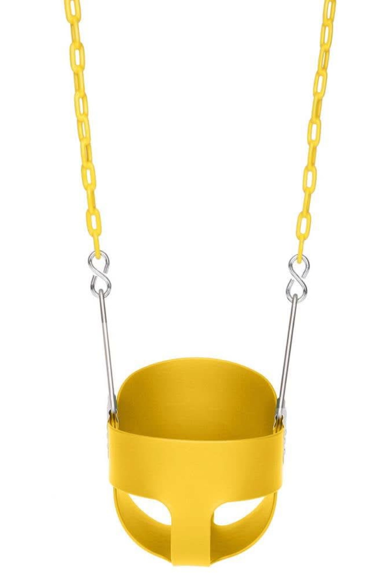 Adult supervision is required. Baby should be sitting up confidently (typically ~6 months) before using this seat. Toddlers (2-3 years+) will outgrow the hammock and can shift to our regular flexible belt swing seat.