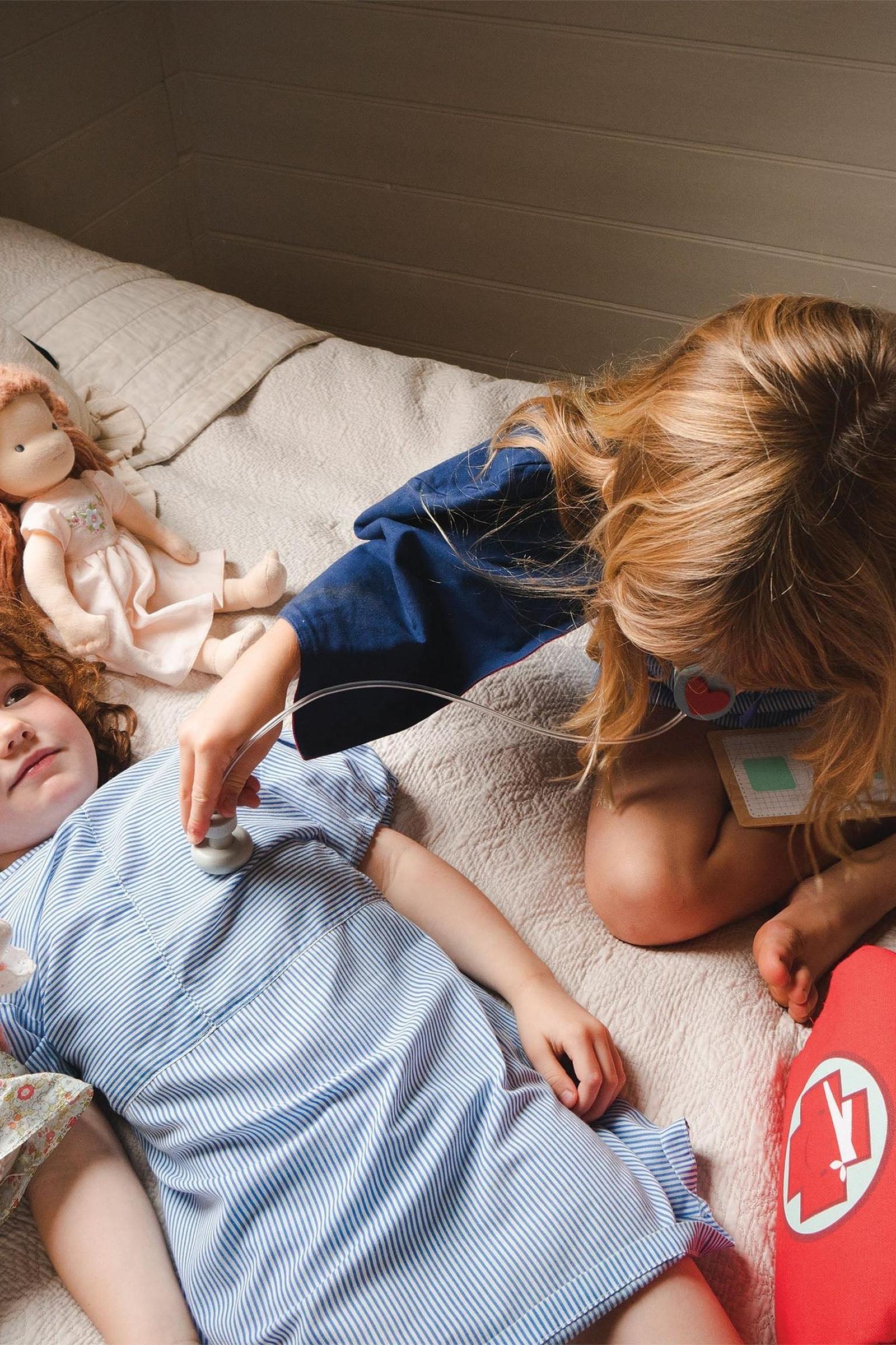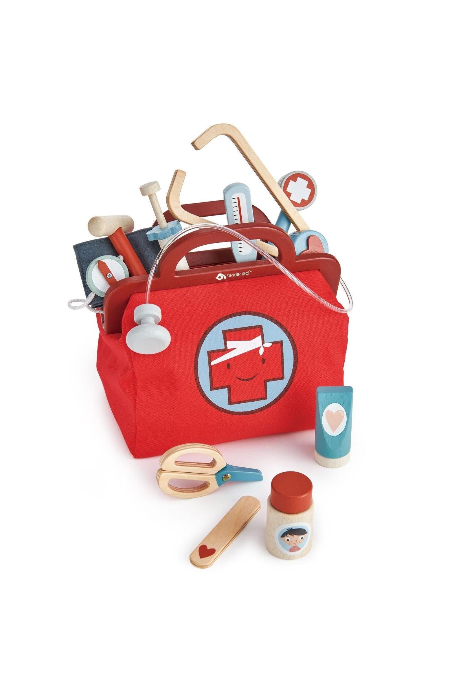 A retro-styled canvas and wood doctor's bag full of all the essentials for treating poorly patients. Set includes: a stethoscope, scissors, an ear probe, a syringe, a doctors knee hammer, a blood pressure monitor, a cloth mask, plasters, stickers showing ailments and remedies, a clipboard, a thermometer, a flat stick, a bottle of pills and a tube of ointment.