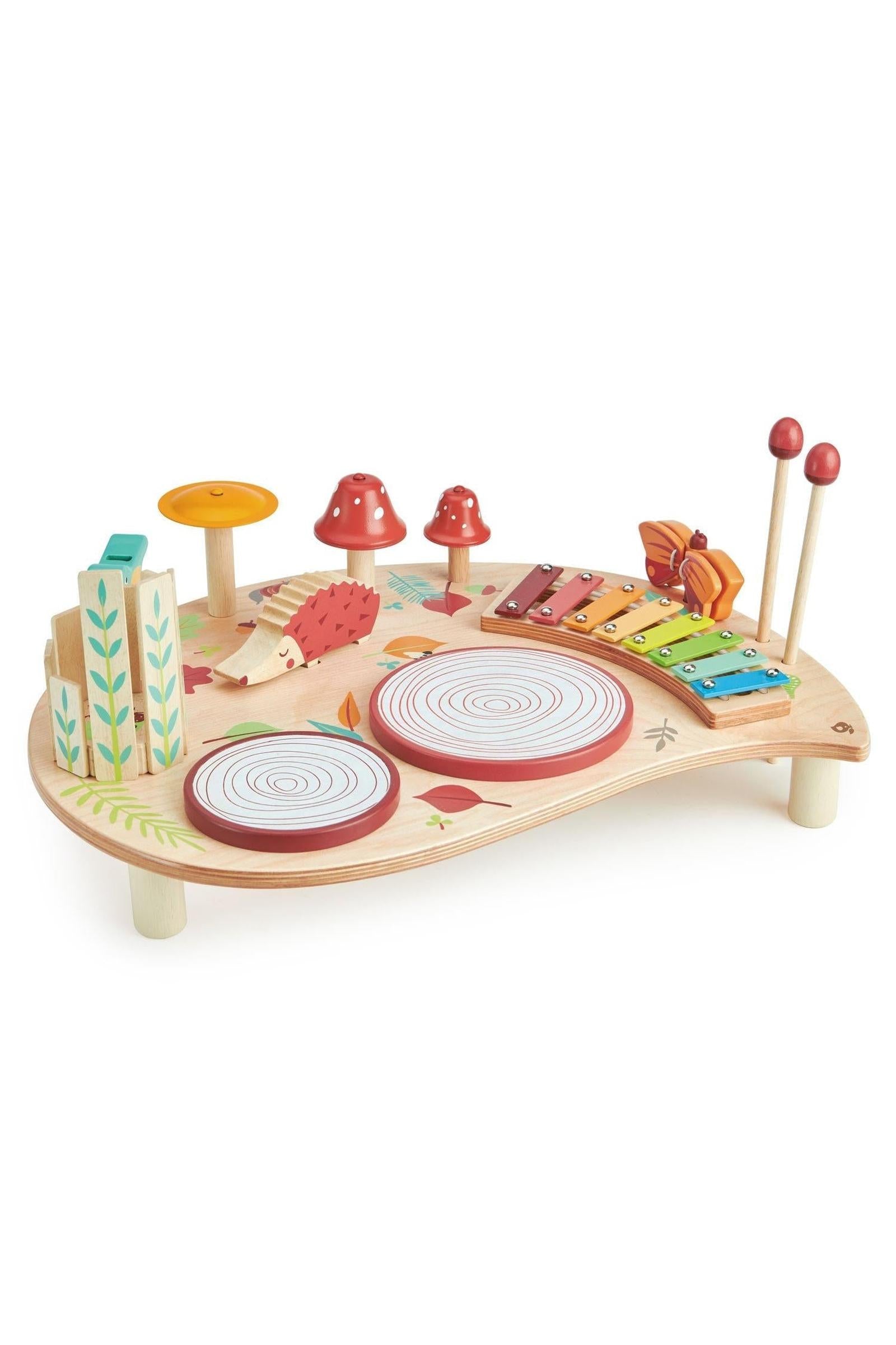 Compose a woodland concert with a table full of friendly instruments. Musical notes dance from the xylophone, the mushroom bell tops jingle when tapped with the acorn stick, one with a bright metal chime, the other with a mellow wooden ring. Children can bang the tree trunk drums, blow the birdie whistle, clack the butterfly wings, and stir the wood chime to make an echo. Rub the stick along the hedgehog back for a satisfying rasp, a gentle introduction to rhythm and texture.