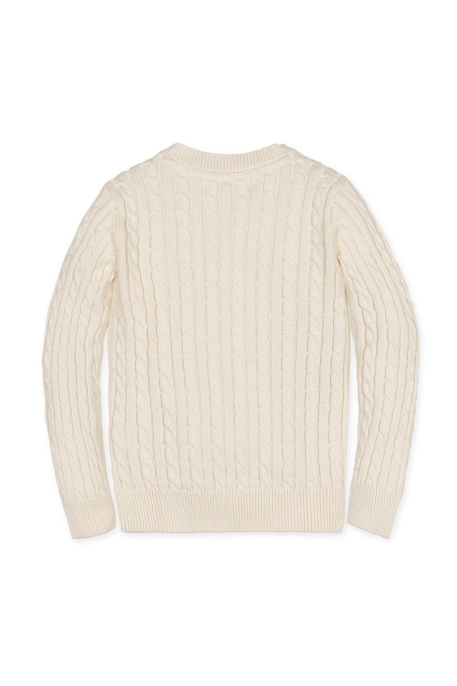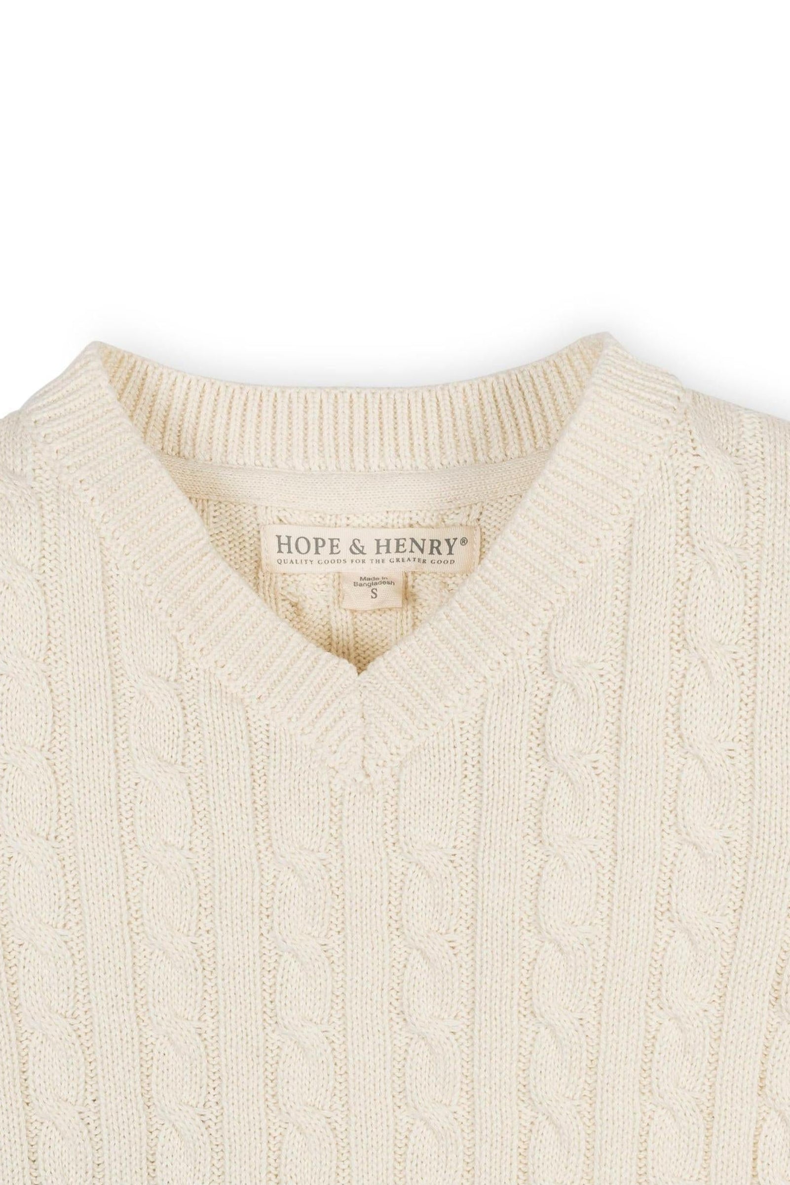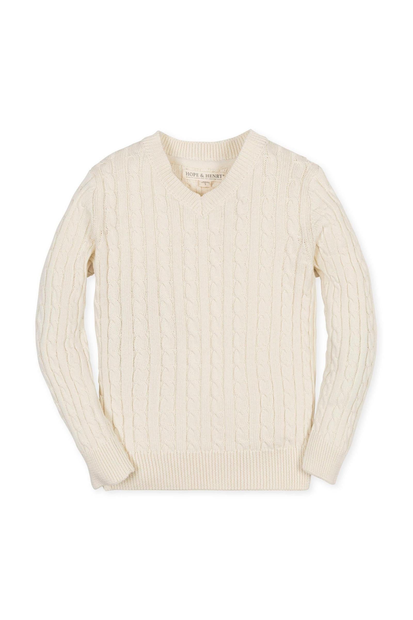 This goes-with-everything sweater is perfect for family photos and holiday parties alike. Features a V-neck with ribbed trim and a beautiful allover ivory cable knit texture. Layers nicely with our collection of organic cotton button downs for a sophisticated look.