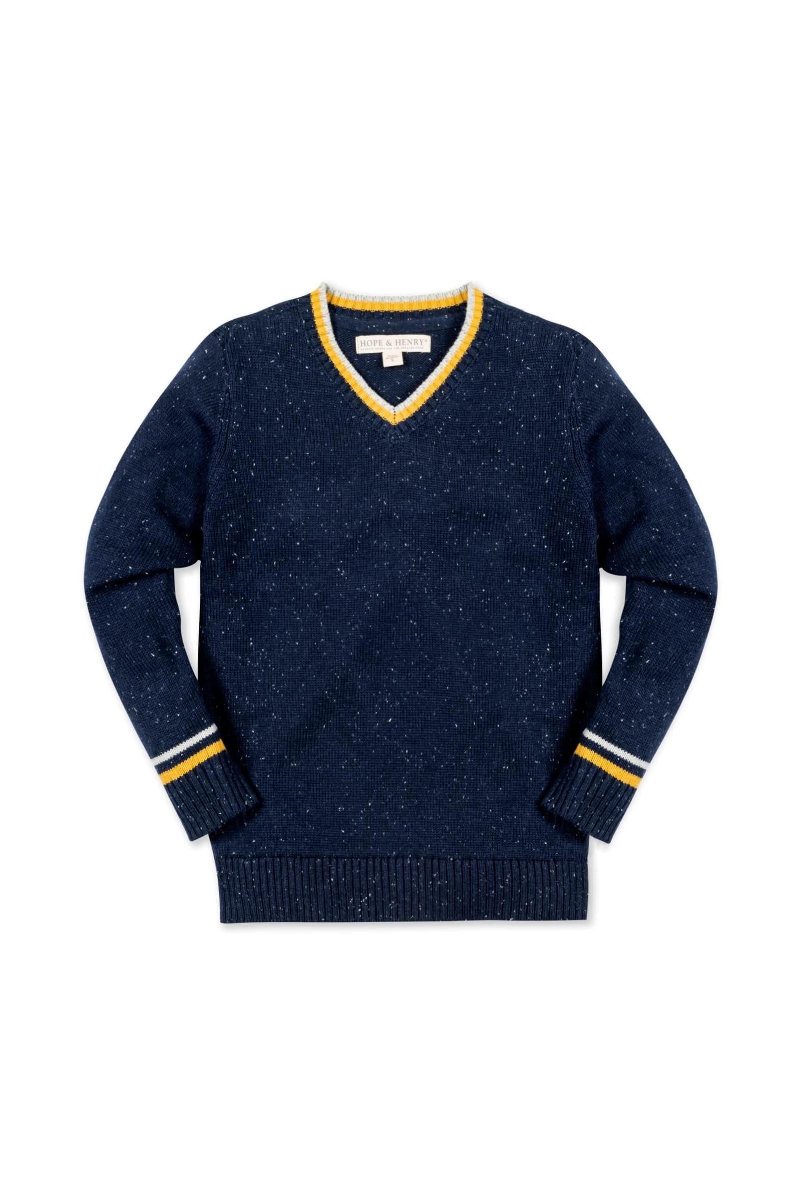 Our organic cotton v-neck sweater is incredibly soft but completely machine-washable, meaning this classic sweater is bound to be a year-round MVP for your little guy. Fleck yarns and athletic tipping at the collar and cuffs elevate the sweater to something special.