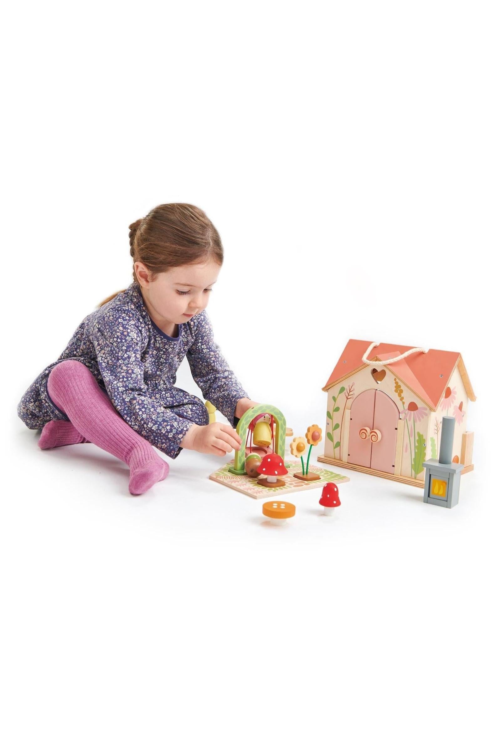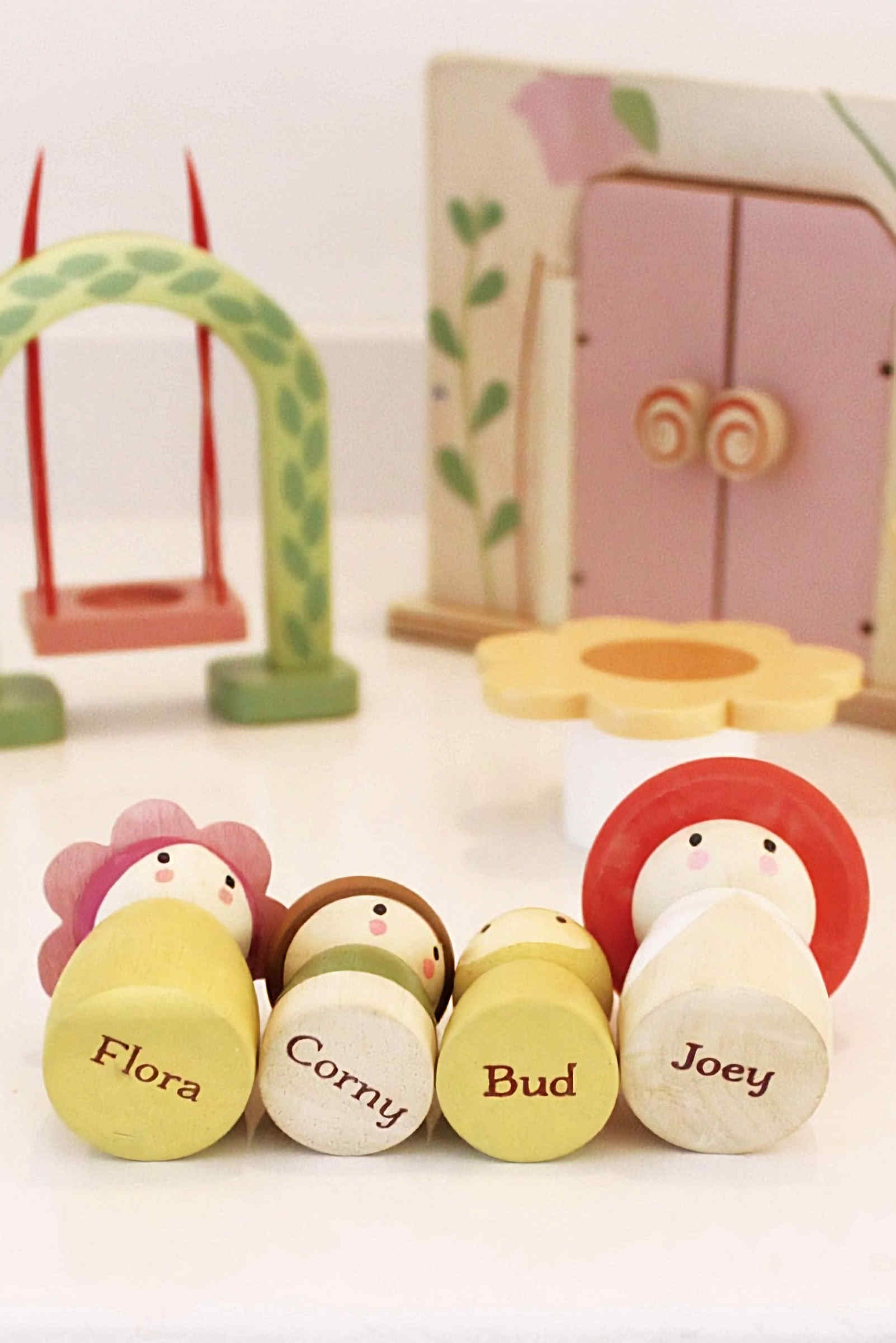 The charming Rosewood Cottage features a rose-colored gabled roof, front doors that open, and a removable back panel, making it easy to take anywhere. Adorned with delicate wildflowers on all sides and two windows allowing flower stems to weave through, it creates a whimsical meadow effect. The back panel folds down into a garden, complete with a swing, flowers, and a toadstool. Included accessories such as a wood-burning stove, flower table, stools, a toadstool lamp, and side table add delightful detail. Ideal for imaginative play, this set offers a cozy scene for Bud, Corny, Flora, and Joey. A thoughtful gift for children or collectors.