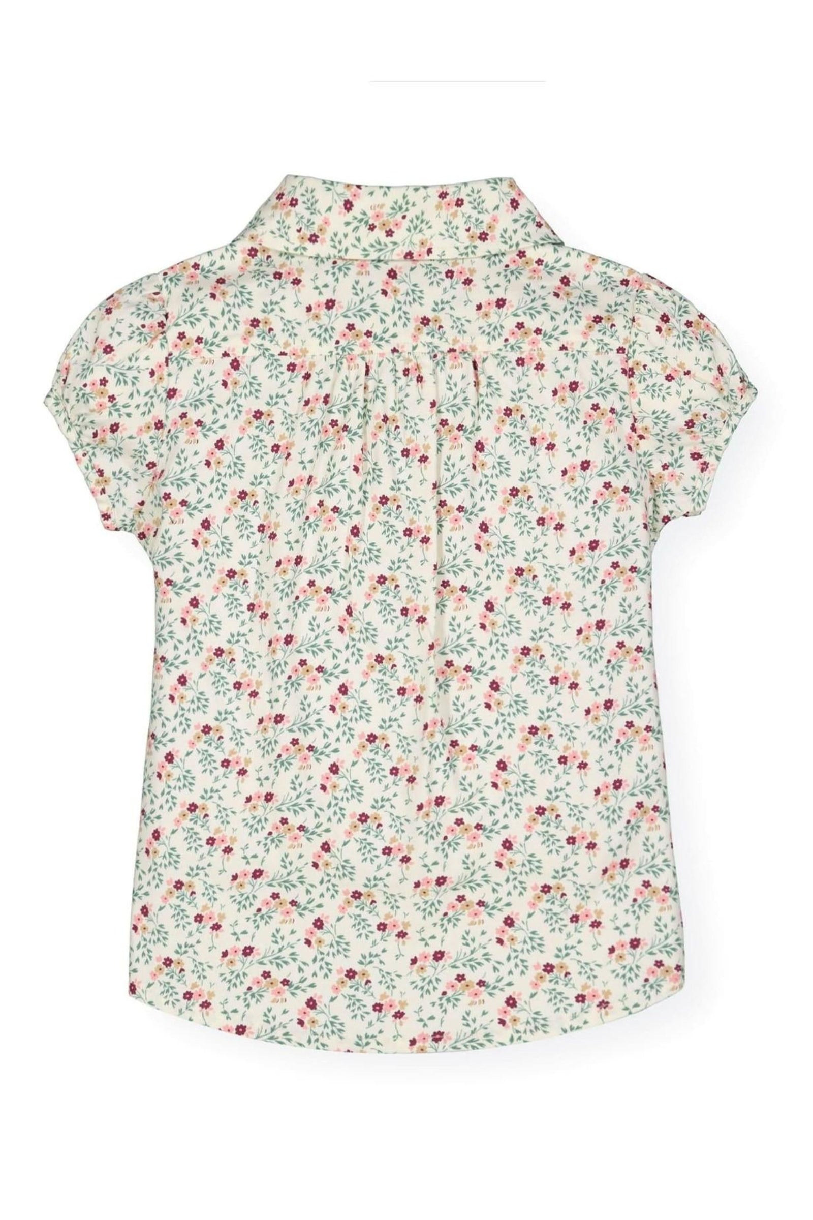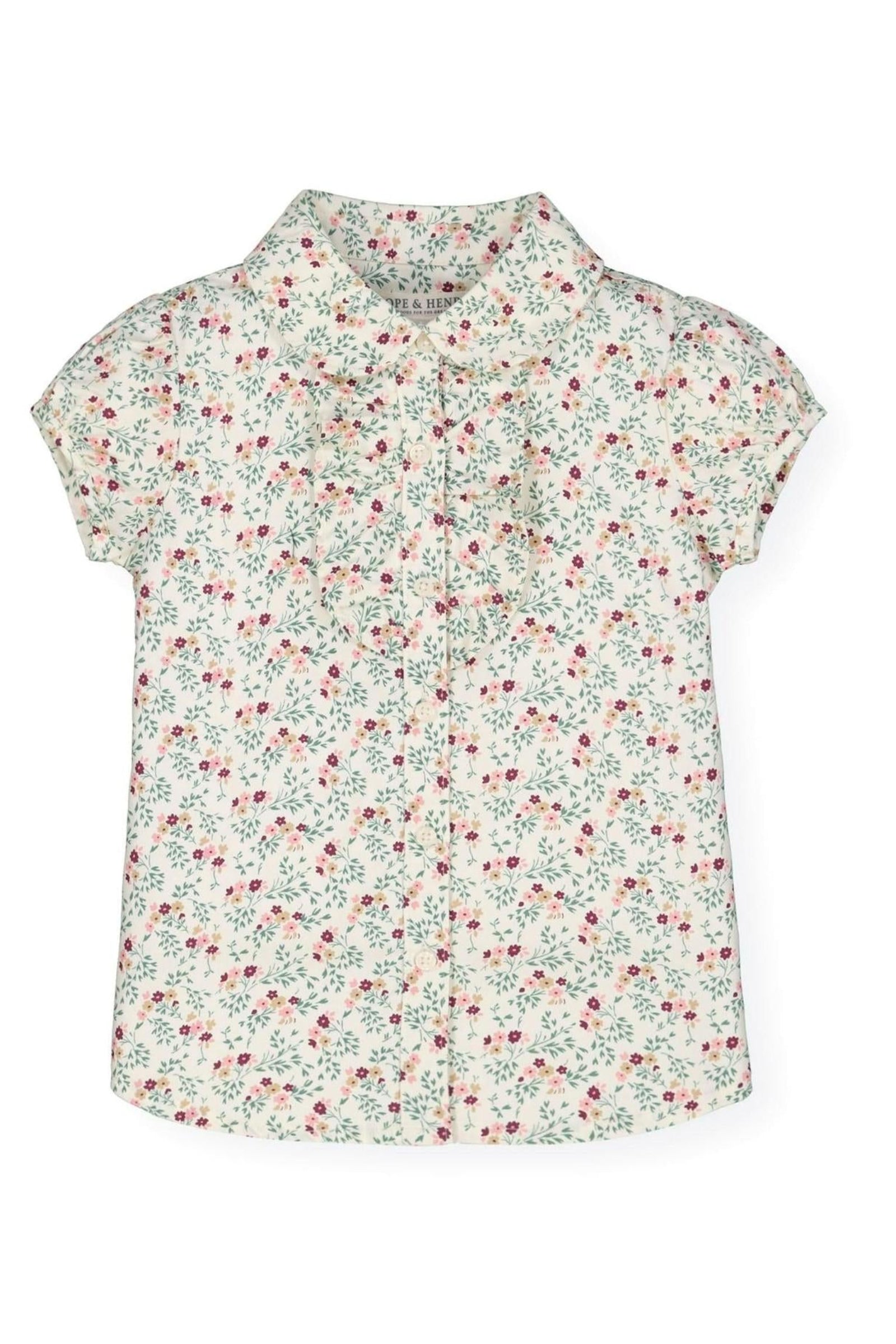 A delicate ruffle front and sweet puff sleeves make this blouse an effortless match for our organic cotton denim or ponte leggings. Features a rounded collar, ruffle details at the center front, and buttons down the center front.