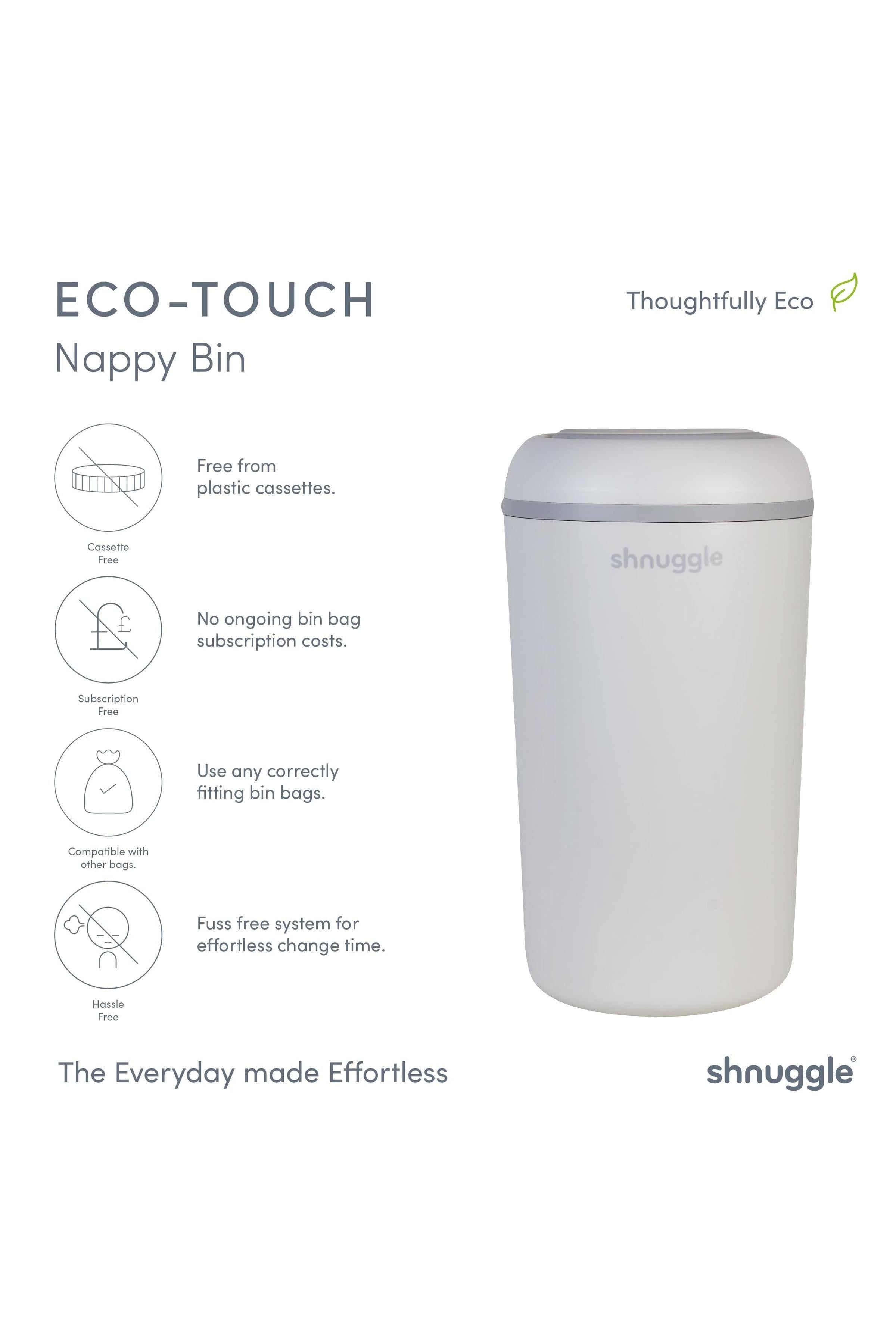 Thoughtfully eco-friendly, the Eco-Touch nappy bin is cassette-free, saving on ongoing costs and plastic waste, and the Better Bag bin liners are 100% biodegradable.