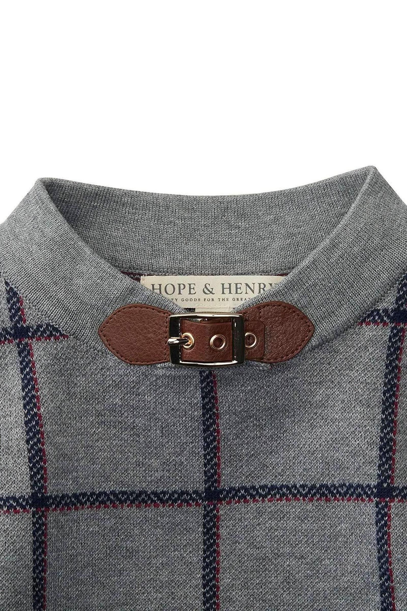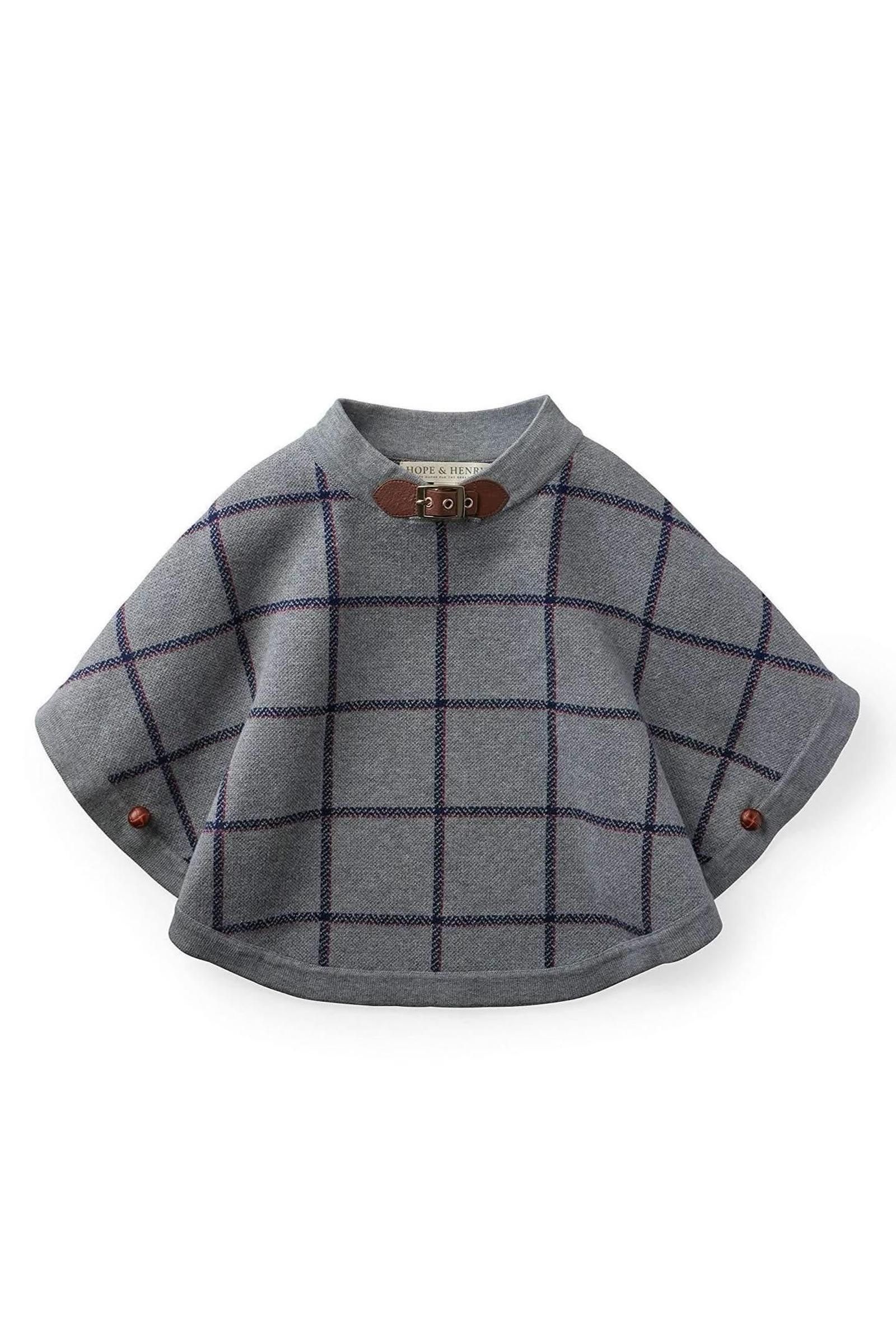 Features a beautiful gray/navy plaid intarsia in our super soft organic cottons, a faux leather and gold buckle closure at the neckline, and faux leather button details at the armholes. Sizes 12-18 months and 18-24 months have a button placket instead of a buckle closure to ensure ease of fit for small children.