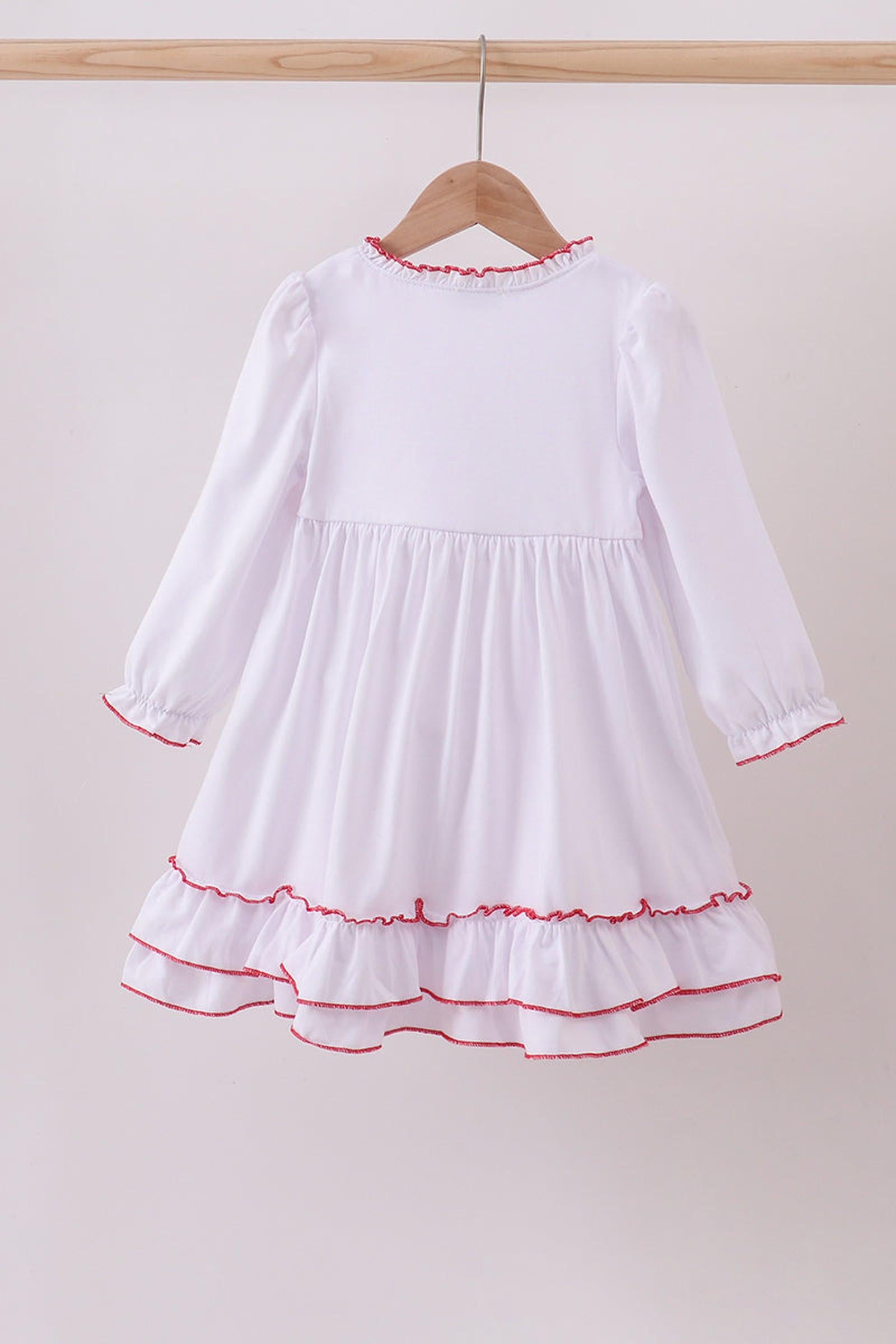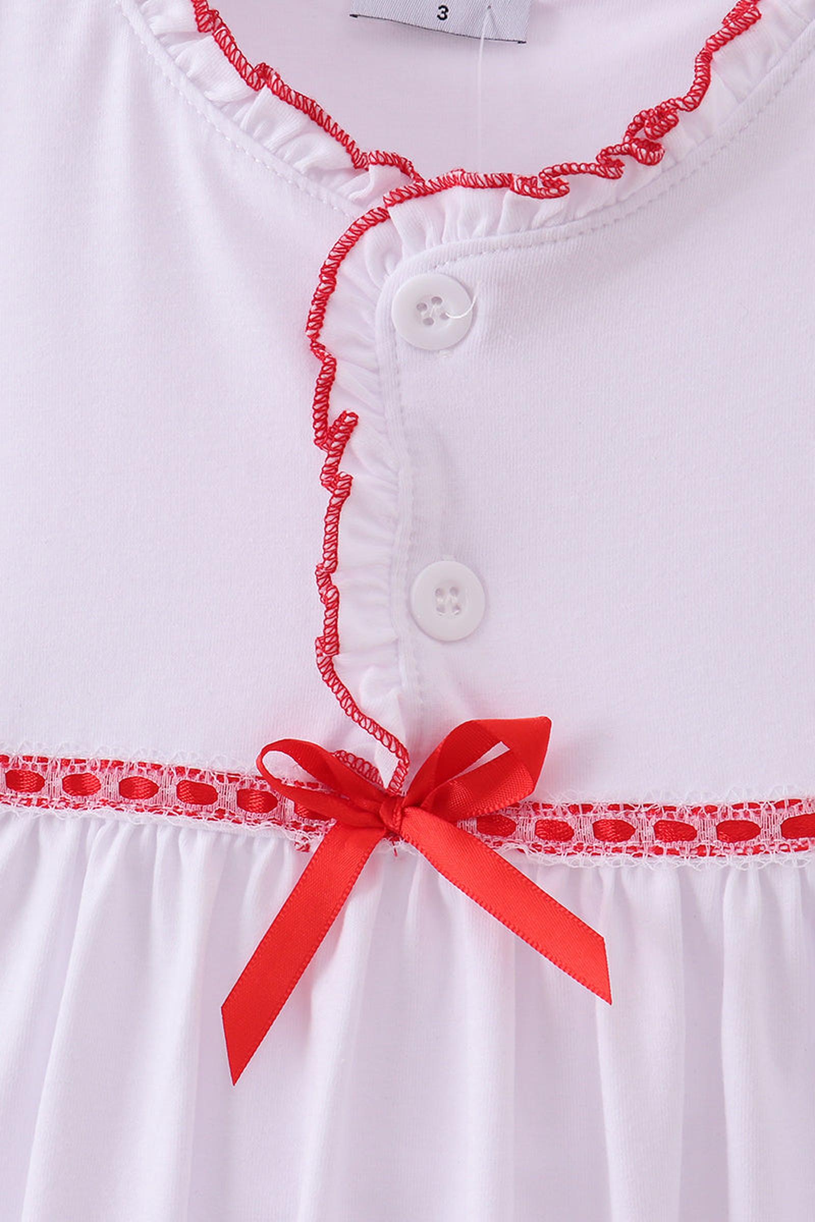 Embrace cozy elegance with this White Bow Ruffle Long-Sleeve Pajama Dress. Featuring delicate ruffles that create graceful movement and a refined bow detail, it offers a perfect blend of comfort and style. An ideal gift choice, this cotton dress ensures both warmth and charm.