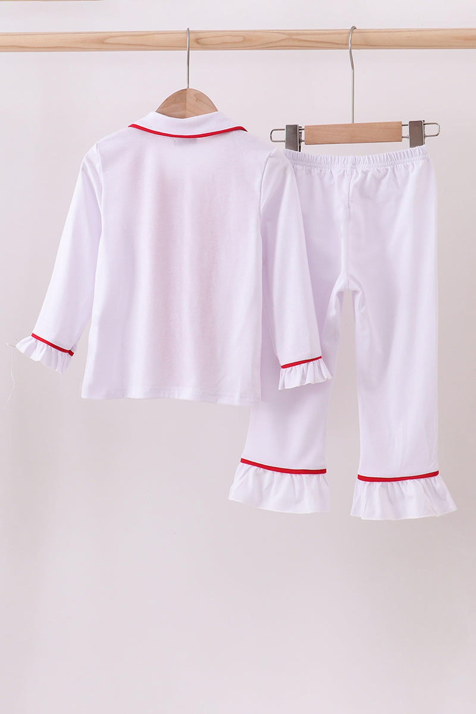 Experience cozy relaxation with this White Ruffle Pajama Pants Set. Crafted from soft cotton and accented with delicate ruffle details, it elevates your sleepwear with a subtle playful charm. Ideal for leisurely mornings or unwinding evenings, this set offers comfort while adding stylish flair to your loungewear essentials.